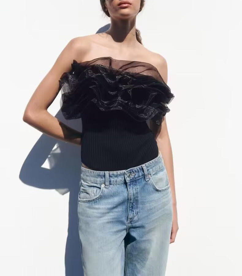 KIKIMORA Strapless Straight Collar Transparent Organza Laminated Decoration Rib Jumpsuit