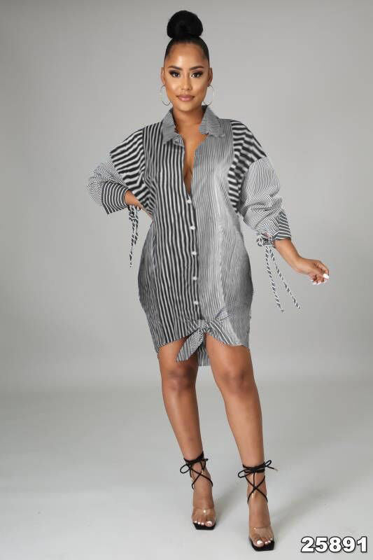 KIKIMORA Striped Stitching Long-sleeved Lapel Dress