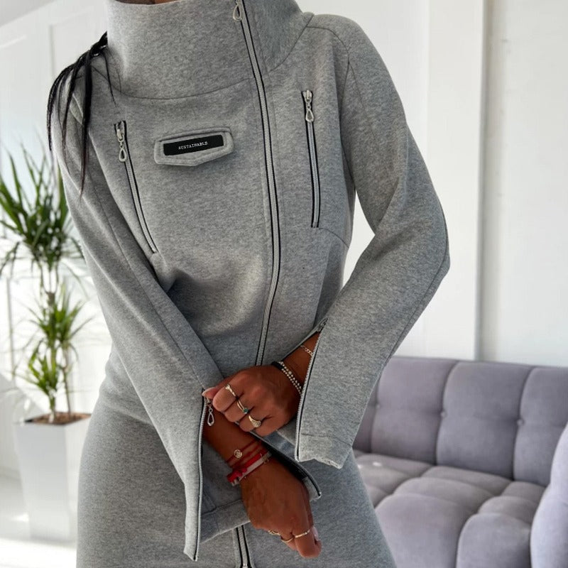 KIKIMORA Gray Turtleneck Zipper Design Slim Fit Dress