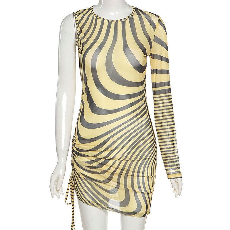 KIKIMORA Round Neck Single-Sleeve Printed Mesh Sexy Dress
