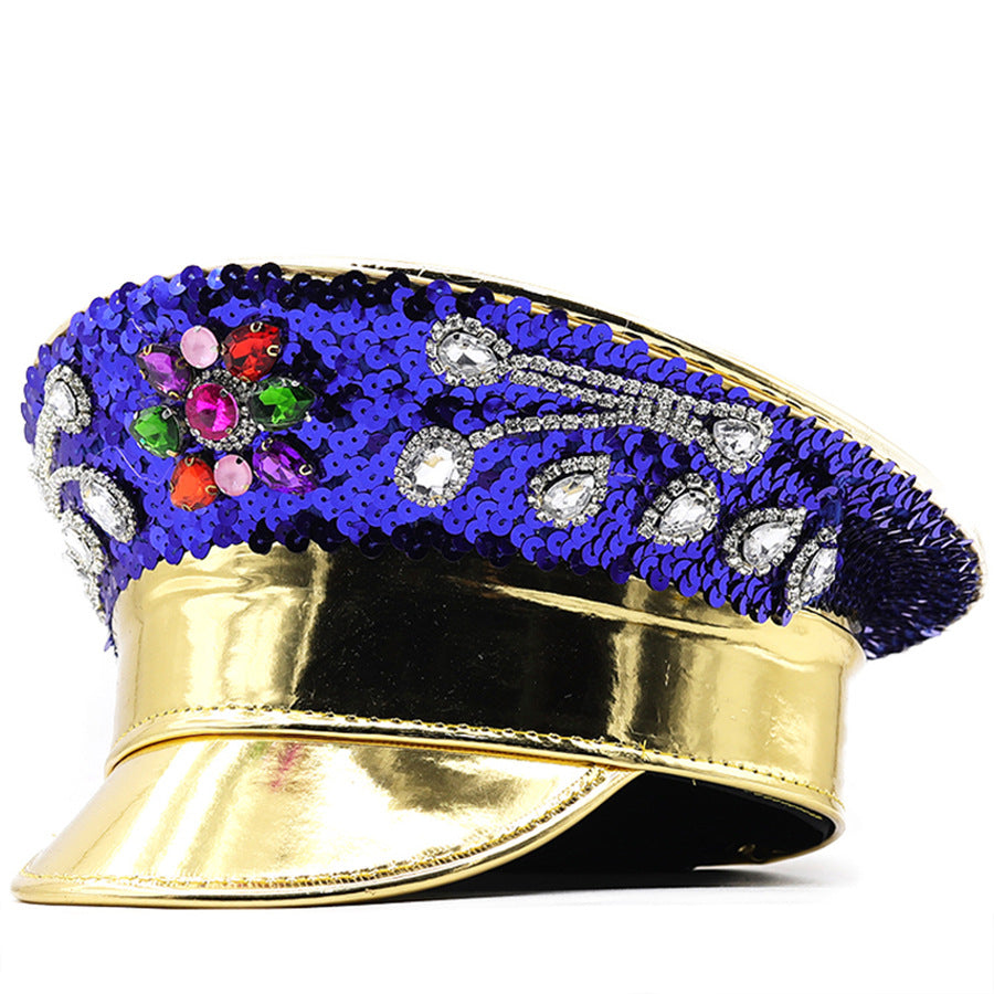 Chapeau bleu marine en cuir et strass assortis avec couronne de diamants