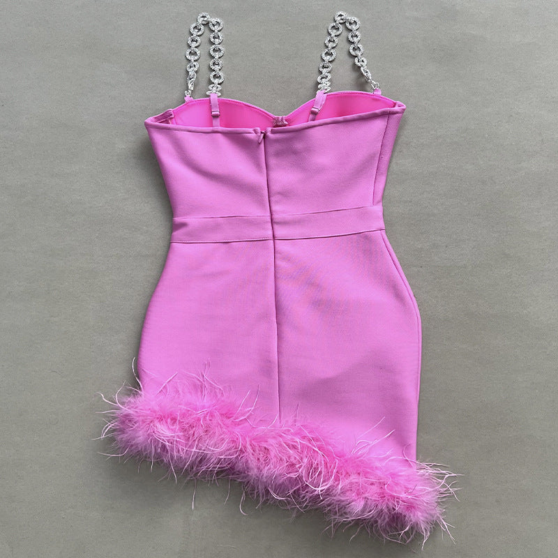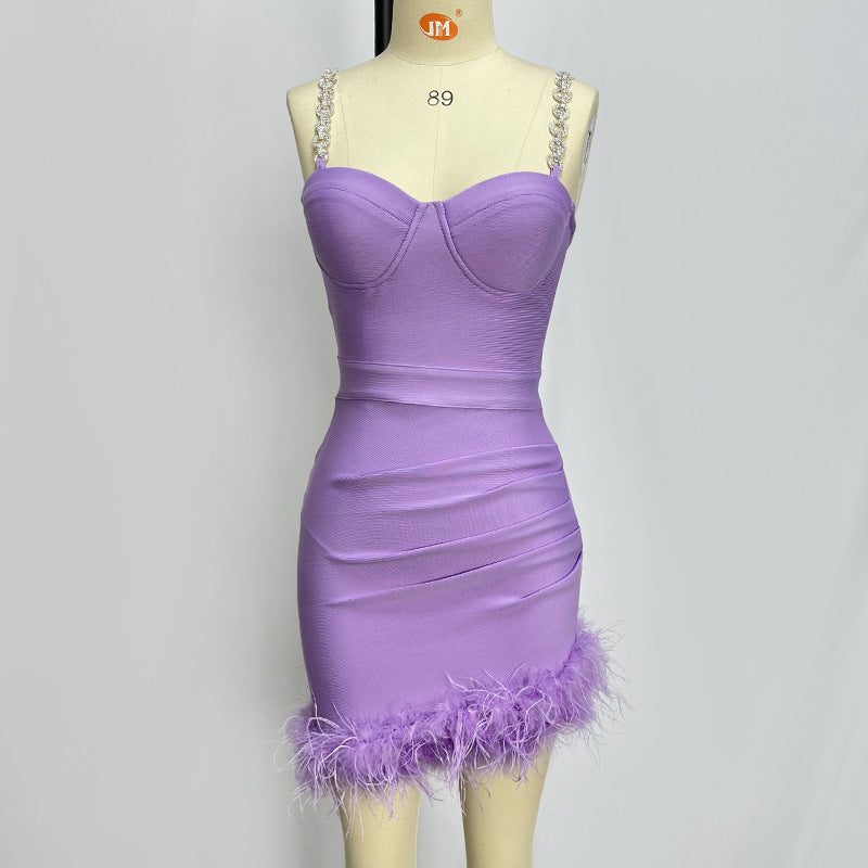 Présentation de notre exquise robe une pièce à bandage en plumes et bretelles métalliques, véritable incarnation de l'élégance et de la sophistication. Confectionnée avec une attention méticuleuse aux détails, cette robe est un chef-d’œuvre qui captivera tous les regards. La sangle en métal ajoute une touche de nervosité, tandis que le design en bandage de plumes crée une silhouette fascinante qui accentue parfaitement vos courbes. Fabriquée à partir de matériaux de haute qualité, cette robe assure à la fois confort et durabilité, ce qui en fait un choix parfait pour toute occasion spéciale. Mettez-vous sous les projecteurs et embrassez votre déesse intérieure avec cette superbe robe qui respire le luxe et la grâce.