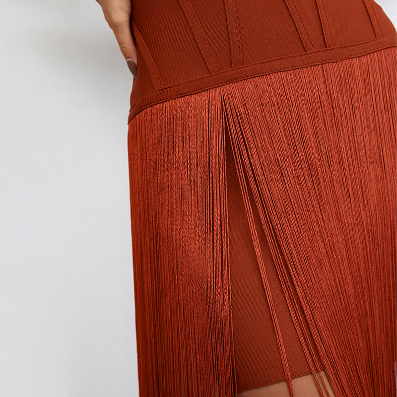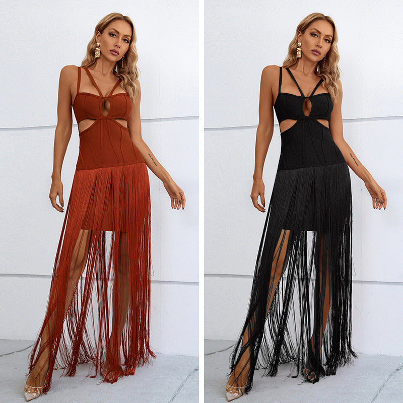 Robe longue à franges rétro à bretelles spaghetti et coupe ajustée