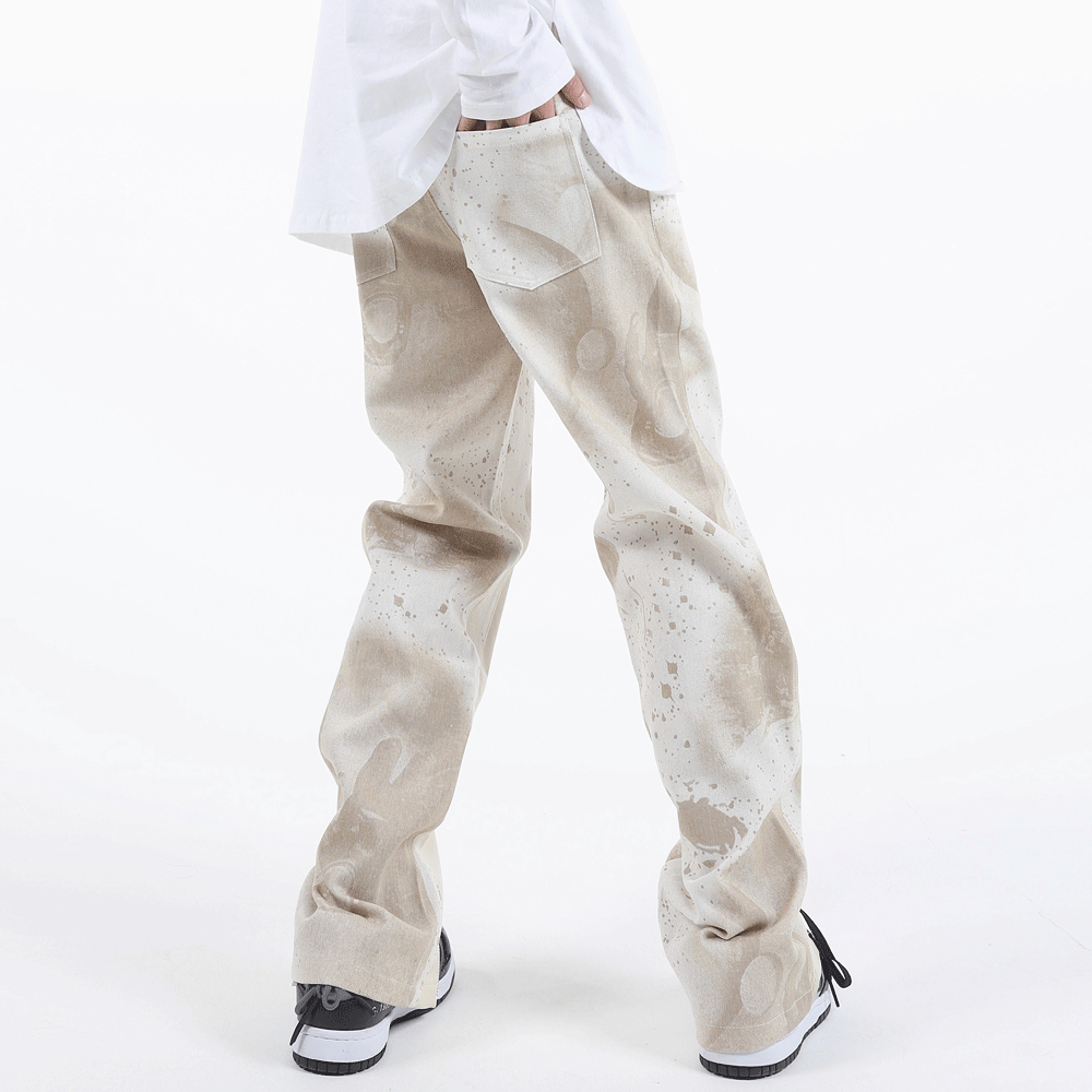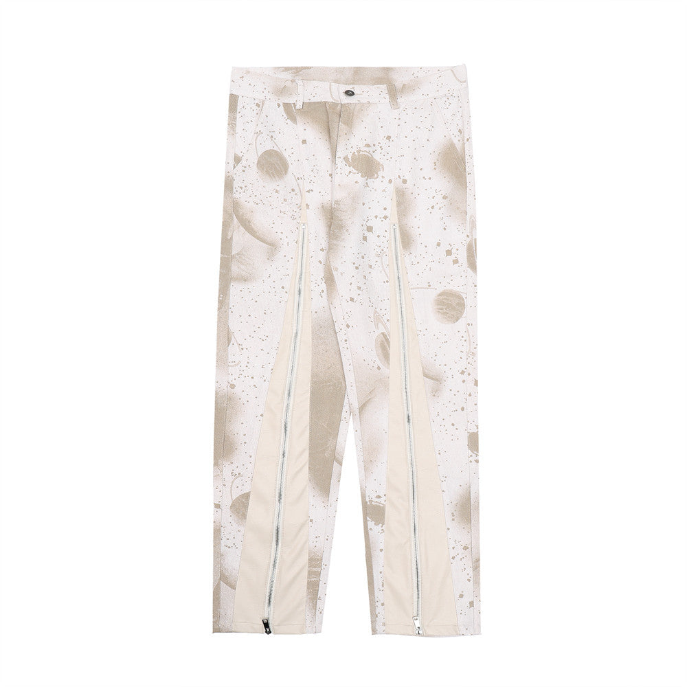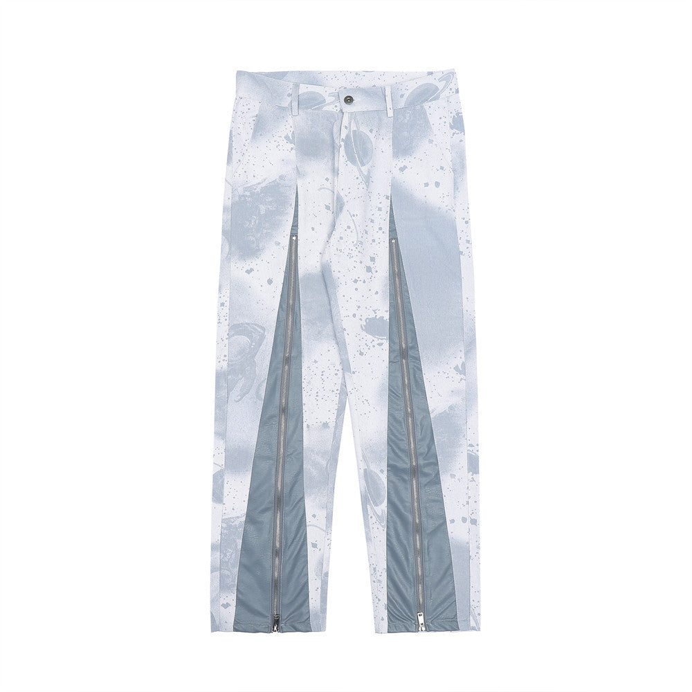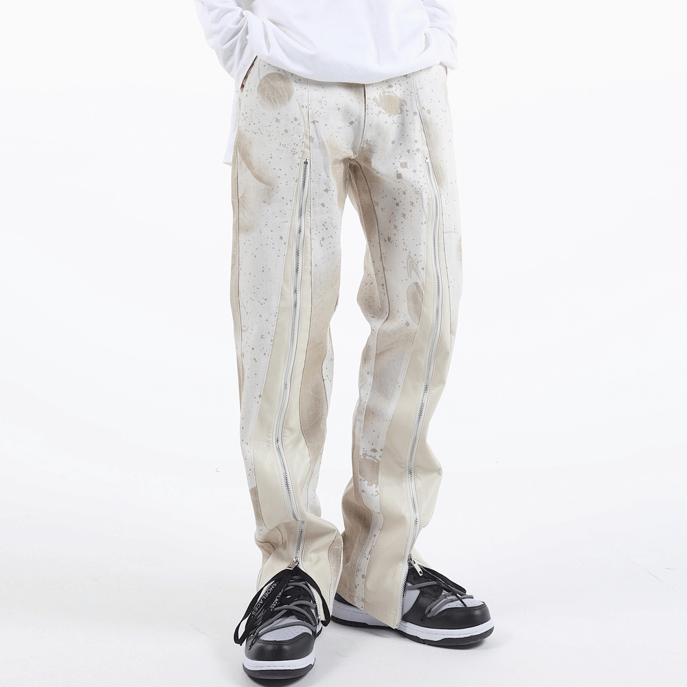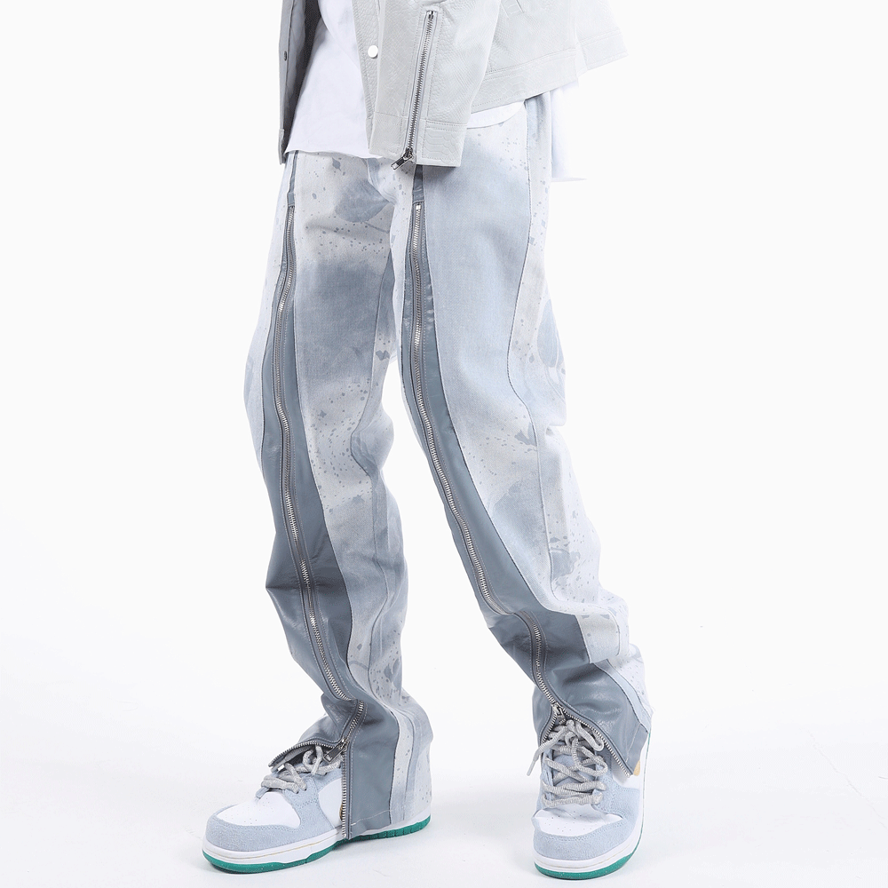 Jeans fendus à glissière et coutures en cuir PU amples à la mode