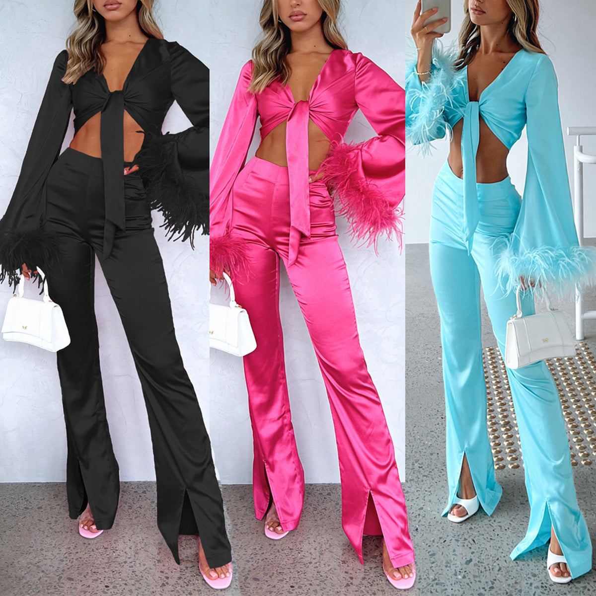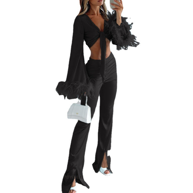 KIKIMORA, ensemble haut manches longues avec surpiqûres pelucheuses et pantalon fendu.